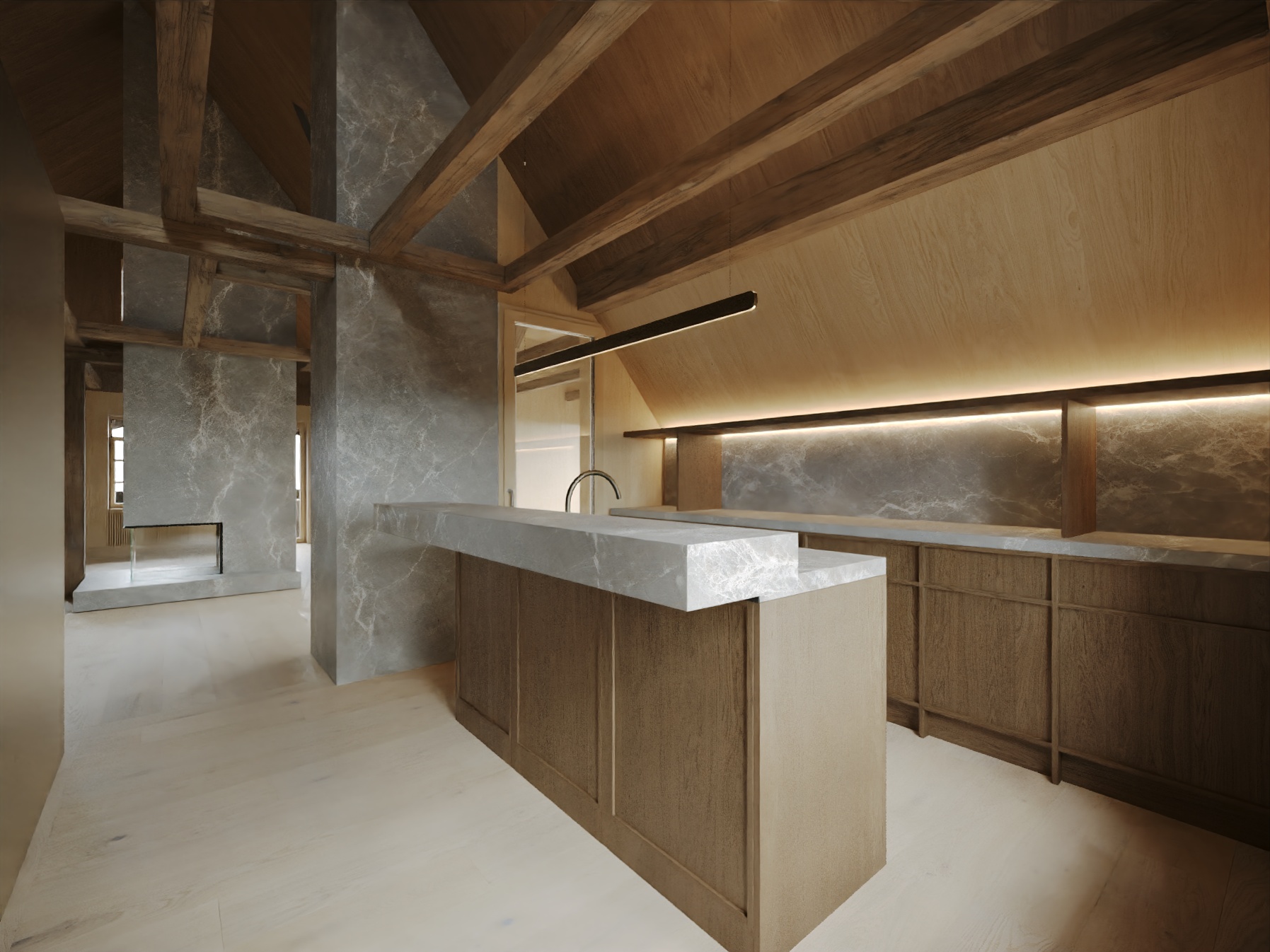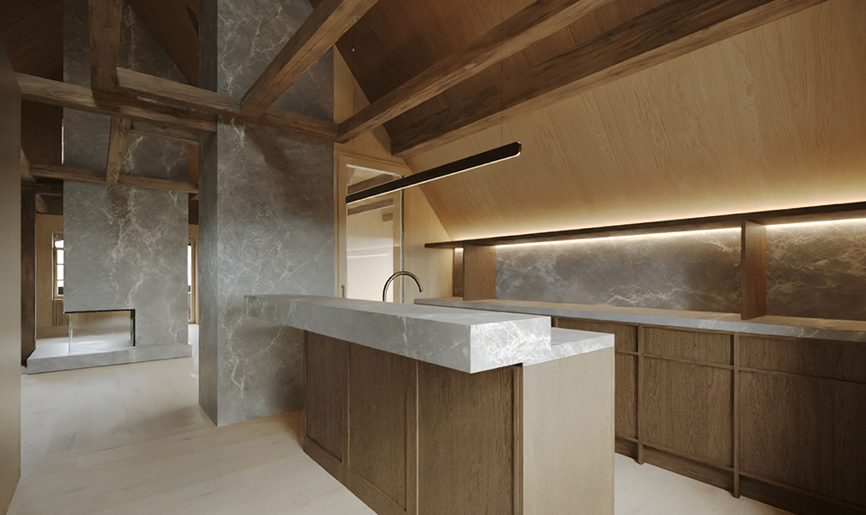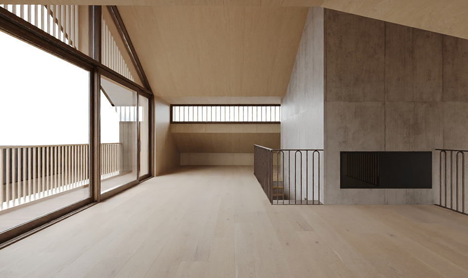 Das imposante Giebeldach übernimmt die klaren und beständigen Linien der Berge und schafft damit eine überzeugende Verbindung zwischen Natur und Architektur, die sich bis in die Innenräume erstreckt.