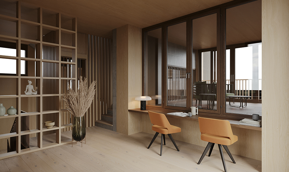 Innerhalb des teils spiralförmig aufgebauten, sowie zweigeschossig organisierten Raumkonzeptes sorgen spannende Raumbeziehungen für ein abwechslungs- und ebenso perspektivenreiches Wohnerlebnis. Indes sind auch alle Neubauten – analog dem Haus «Titlis» durch eine elegante Treppe oder dem persönlichen Homelift erschlossen.